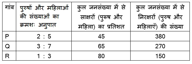 | Q.30 | दी गई तालिका का अध्ययन कीजिए, और नीचे दिए गए प्रश्न का उत्तर दीजिए। दी गई तालिका तीन अलग-अलग गांवों की जनसंख्या में, जनसंख्या और साक्षरता/निरक्षरता दर के आंकड़े दर्शाती है।
